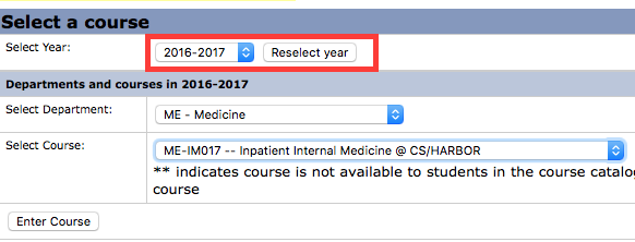 * If the Summative Evaluation is in a previous academic year, change the year by clicking on "change course" next to "Search and Edit Evaluations" title (at the top of the page); then select "Reselect Year."